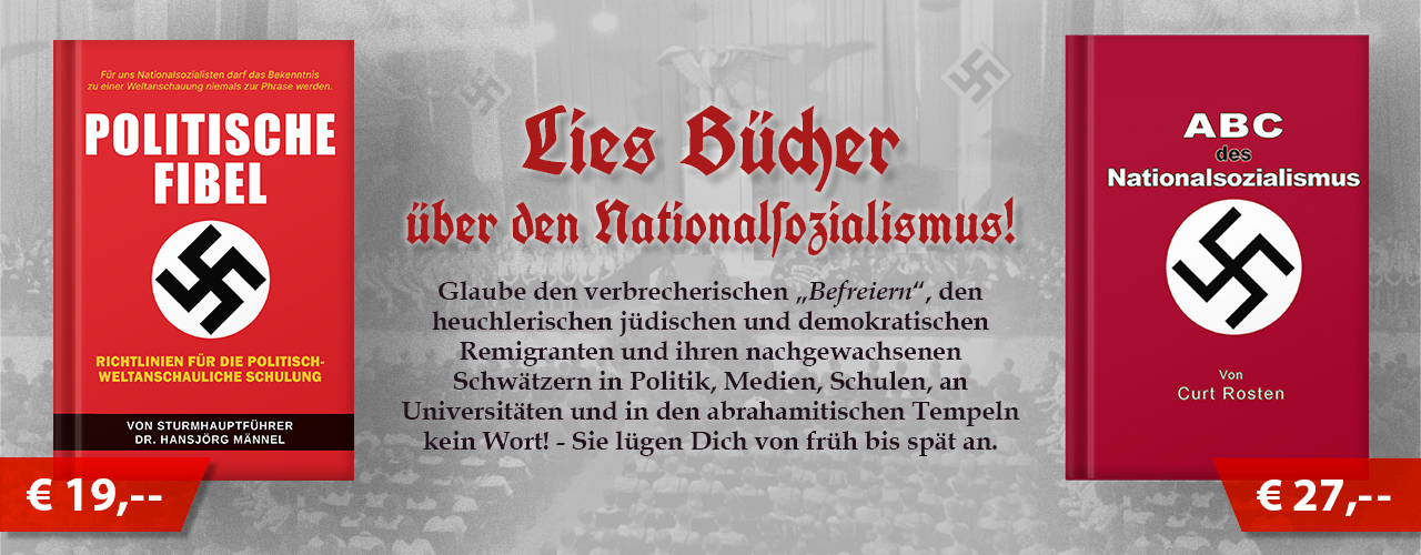 +++Beim Schelm dauert es mit der Lieferung etwas länger als bei Amazion – nicht etwa, weil ich in der Ferne meine braune Seele baumeln lasse, sondern aufgrund der spezifischen Bedingungen, unter denen ich gezwungen bin, als Verleger zu arbeiten. Dazu kommt eine bewußt "umwegige" Lieferkette, sonst wäre es für die Feindseite (dumme Antifanten + noch dümmere Bullen) gar zu einfach. Und das wollen weder ich noch Sie, richtig?+++