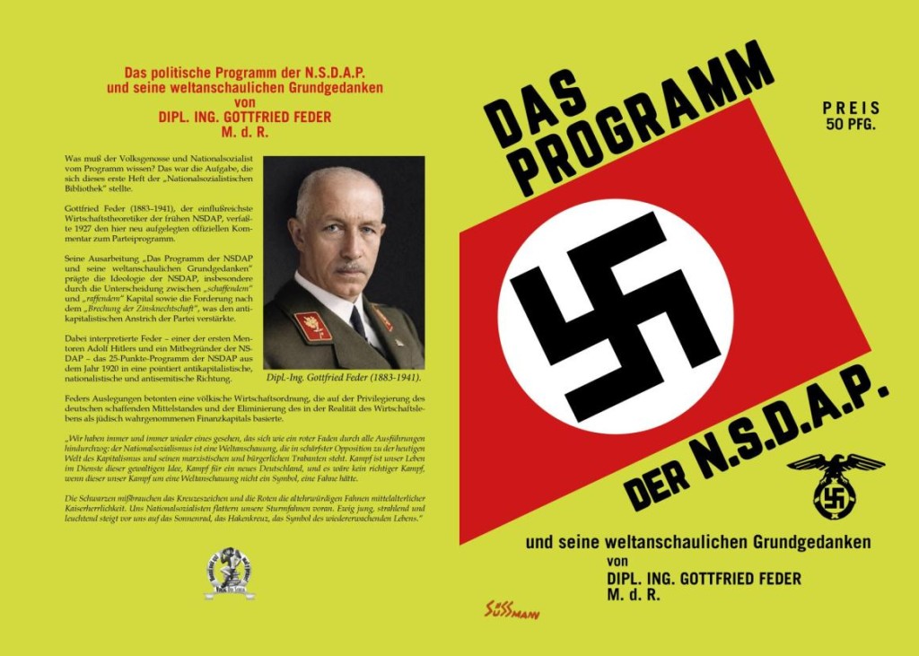 Dabei interpretierte Feder – einer der ersten Mentoren Adolf Hitlers und ein Mitbegründer der NSDAP – das 25-Punkte-Programm der NSDAP aus dem Jahr 1920 in eine pointiert antikapitalistische, nationalistische und antisemitische Richtung.