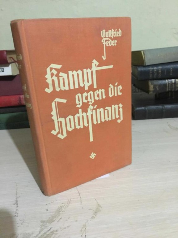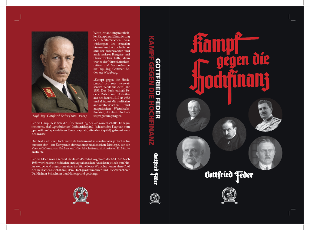 „Kampf gegen die Hochfinanz“ ist sein wegweisendes Werk aus dem Jahr 1933. Das Buch enthält Feders Reden und Aufsätze aus den Jahren 1919 bis 1933 und skizziert die radikalen antikapitalistischen und antijüdischen Wirtschaftstheorien, die das frühe Parteiprogramm prägten.