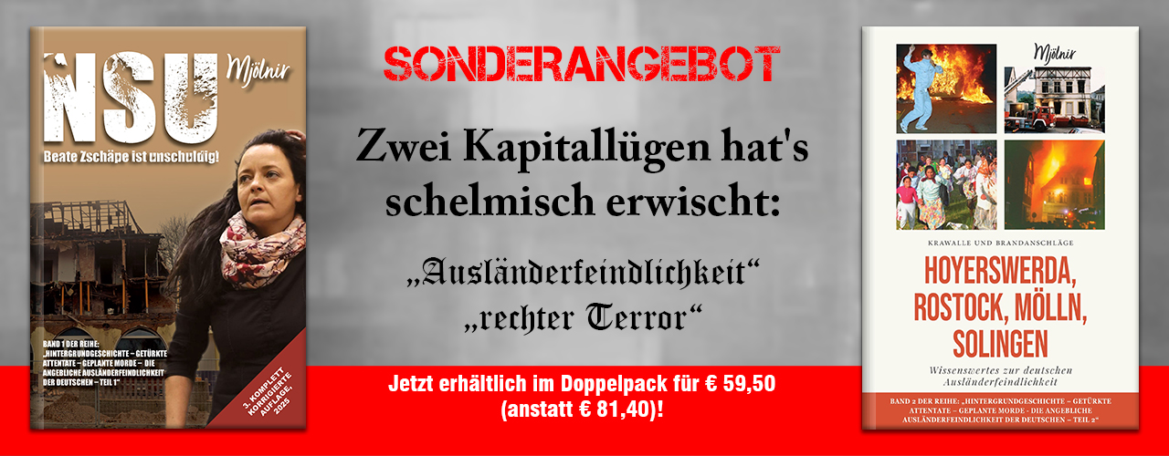 +++Beim Schelm dauert es mit der Lieferung etwas länger als bei Amazion – nicht etwa, weil ich in der Ferne meine braune Seele baumeln lasse, sondern aufgrund der spezifischen Bedingungen, unter denen ich gezwungen bin, als Verleger zu arbeiten. Dazu kommt eine bewußt "umwegige" Lieferkette, sonst wäre es für die Feindseite (dumme Antifanten + noch dümmere Bullen) gar zu einfach. Und das wollen weder ich noch Sie, richtig?+++