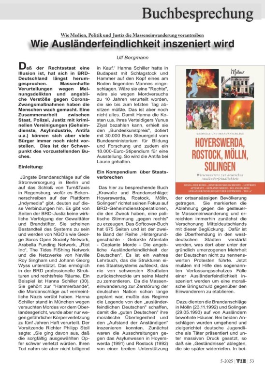 „Das Buch „Krawalle und Brandanschläge: Hoyerswerda, Rostock, Mölln, Solingen“ richtet seinen Fokus auf BRD-Geheimdienstoperationen, die den Zweck haben, eine politische Stimmung „gegen rechts“ zu erzeugen. Zunächst waren die Ausschreitungen gegen das Asylunwesen in Hoyerswerda (1991) und Rostock (1992) von einer breiten Unterstützung der ortsansässigen Bevölkerung getragen. Sie markierten die Ablehnung gegen die gesteuerte Masseneinwanderung und erreichten immerhin zunächst die Verschonung Mitteldeutschlands Jetzt mußte mit Hilfe des sogenannten Verfassungsschutzes Fälle einer Ausländerfeindlichkeit inszeniert werden um eine moralische Bringschuld gegenüber den Einwanderern zu etablieren. Dazu dienten die Brandanschläge in Mölln (23.11.1992) und Solingen (29.05.1993) auf von Ausländern bewohnte Häuser. Bei beiden Anschlägen wurden umgehend und zielgerichtet deutsche Jugendliche als Täter präsentiert und unter massiven Druck gesetzt, so daß sie „Geständnisse“ ablegten, die sie später widerriefen. In beiden Fällen gab es große Medienkampagnen mit massiver Vorverurteilung und politischer Tendenz. Es folgten die „Hetzjagden“ in Magdeburg (1994), Guben (1999) und Mügeln (2007), die „Brandanschläge“ in Lübeck (1995 und 1996) und Krefeld (1997) und der angebliche Mord an einem Jungen in Sebnitz (1997). In allen Fällen war die Tendenz vorgegeben, losgelöst von der tatsächlichen Faktenlage. Der „Aufstand der Anständigen“ konnte losgehen, eine billige Inszenierung der politischen Klasse. Ganze Reportermeuten zogen los um über die Städte herzufallen um dort die Strukturen einer vorgeblichen „Gewalt gegen Ausländer“ zu ergründen. Die Gutmenschen wurden geboren. Im Buch sind die ganzen Widersprüche und Schwachstellen der vorgenannten Anschläge dargelegt, die als offene Wunde in der Geschichte des BRD-Regimes bleiben und zu seinem Ende beitragen könnten. Das Buch muss jeder lesen, der die kriminellen Strukturen eines Staates verstehen will, der vor einem massiven Vertrauensverlust steht.“