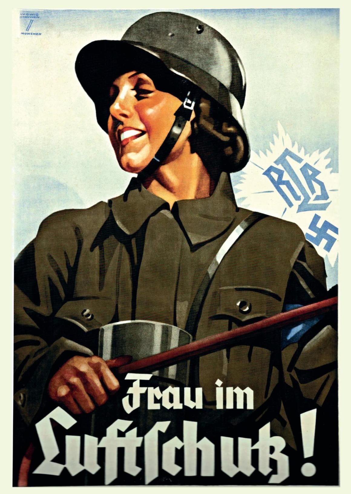 Dieses Plakat wurde 1936 von Ludwig Hohlwein für den Reichsluftschutzbund (RLB) entworfen. Es rief deutsche Frauen zur Teilnahme an zivilen Luftschutzmaßnahmen auf.
