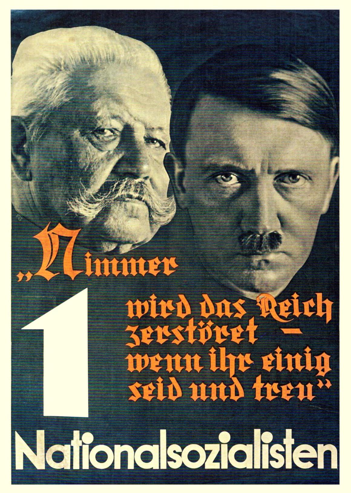 Dieses Plakat stammt von der Reichstagswahl im März 1933, der letzten Wahl, an der noch die das Volkstum zersetzenden Judäodemokraten und auch die KPD teilnehmen durften. Es zeigt Reichspräsident Hindenburg und Reichskanzler Hitler. Die Bildunterschrift lautet: „Das Reich wird niemals untergehen, wenn ihr vereint und loyal seid.“