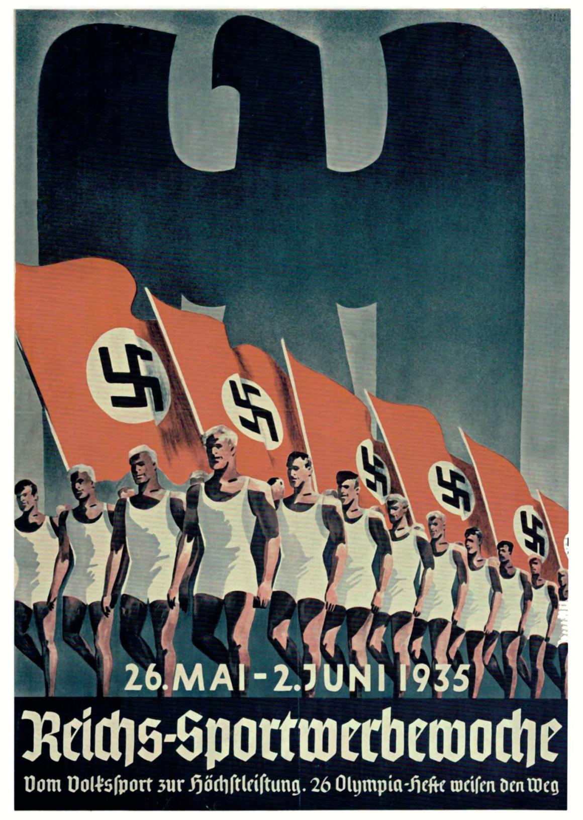 Es zeigt eine Illustration athletischer Männer in weißem Sportzeug, die mit Hakenkreuzfahnen unter einem schwarzen Adler marschieren.