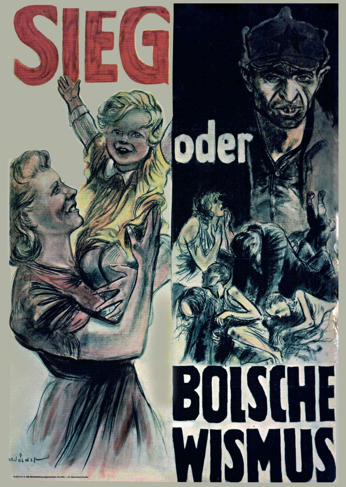 Dieses 1943 entstandene Plakat mit dem Titel „Sieg oder Bolschewismus“ wurde von dem Künstler Hans Schweitzer (unter dem Pseudonym Mjölnir) geschaffen, um dem deutschen Volk die Alternativen der Fortsetzung des Krieges im Osten aufzuzeigen.